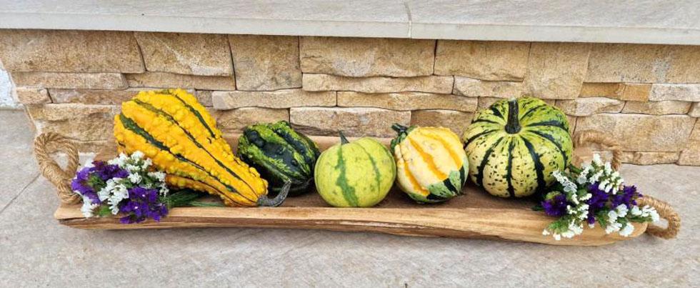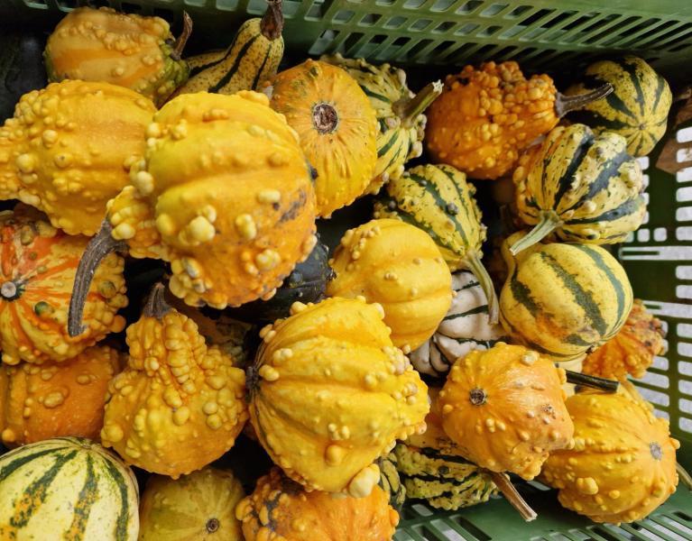Zierkürbisse und Kürbisse in verschiedenen Größen und Farben